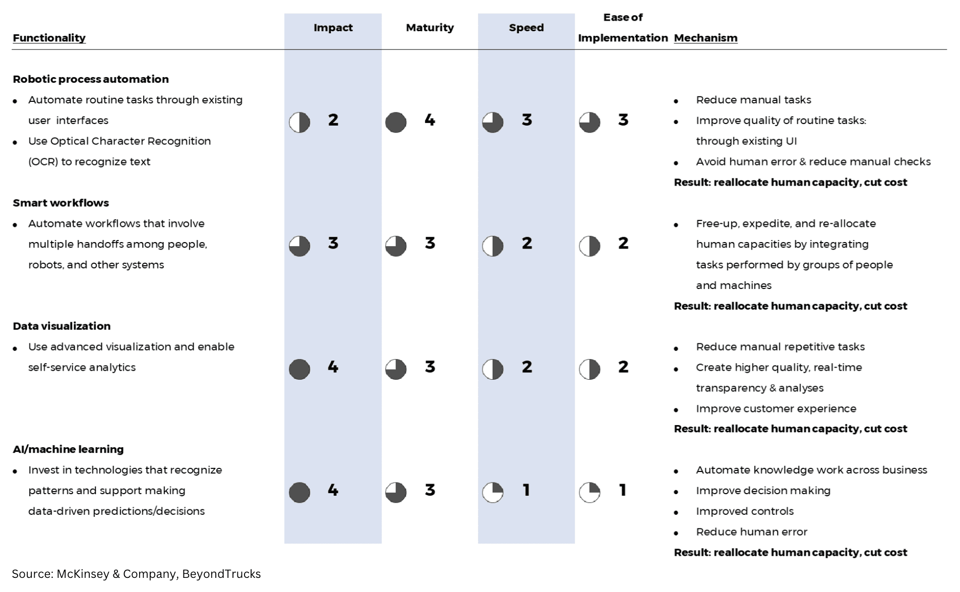 BeyondTrucks has conducted many automation assessments over the last 2 years. McKinsey & Company provides a pragmatic framework for assessing the various automation tools available for motor carriers covering robotic process automation (RPA), Smart Workflows, Data Visualization, and artificial intelligence/machine learning (ai/ml). See the graphic on the following page.