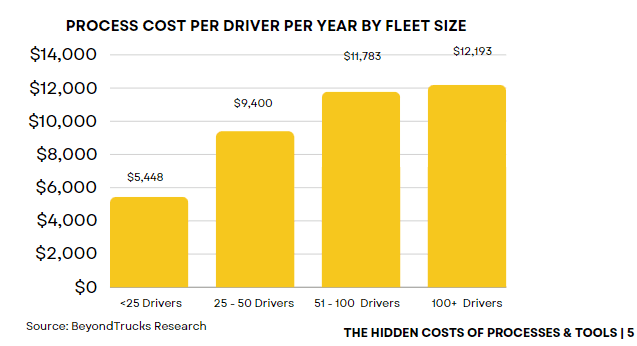 Process costs rise with carrier size, as the complexity and management challenges organizations face increase. While large carriers benefit from better economies of scale when purchasing fuel, equipment, or accessing capital, they use expensive human labor to solve management challenges by building layered organizations, having humans double or triple check things or inadvertently are more challenged to retain drivers or provide quality customer service. On top of that, for larger fleets, cost numbers get compounded: a 100-driver fleet spends $1.2M per year on poor processes; we most recently had a 700-driver fleet spending $15.5M per year due to poor work flows and an antiquated tech stack.