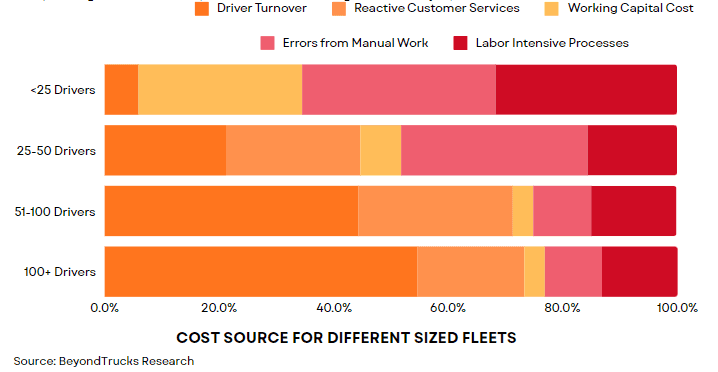 As carrier size increases, we find that the cost of poor processes and tools manifests itself increasingly in the form of driver turnover and customer losses. First, the driver turnover observation is consistent with the American Trucking Associations’ findings that the small fleets in 2021 saw about 70% annualized driver turnover whereas large fleets are closer to 90%. While certain parts of driver turnover are clearly structural or involuntary, any workflow, management process, or tool that aggravates voluntary driver turnover only by a small percentage will generate material costs for that fleet. Similarly, the materiality of key accounts with larger fleets generally is so big that even small servicer failures can cause a material hit to the business.